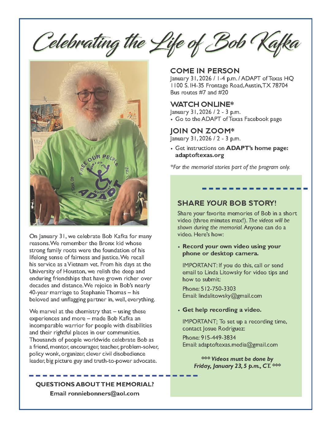 Donations can be made in memory of Bob Kafka to ADAPT of Texas HERE.